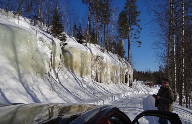 ![]() Een laatste stake-out van tiira en een heel eind naar het zuidoosten was die van Grijskopspecht, die we inderdaad te zien kregen hier, zij het met wat audio-ondersteuning. http://observado.org/waarneming/view/74366951 Daar vlakbij was ook de ijsmuur van onderstaande foto, een mooie laatste herinnering aan deze winterreis. |