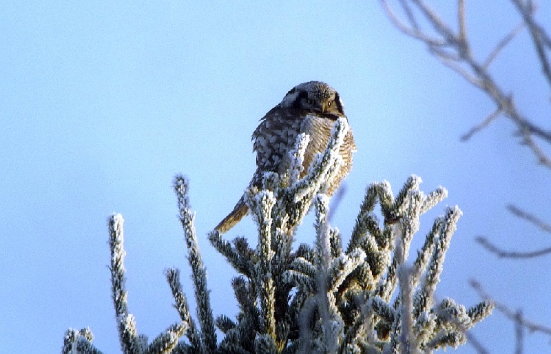 ![]() Een echte tiira stake-out was deze Sperweruil, in een onooglijk bosje in het boerenland ten zuiden van Oulu. Snel gevonden want hij zit graag op een opvallende plek met goed uitzicht. http://observado.org/waarneming/view/74285116 |