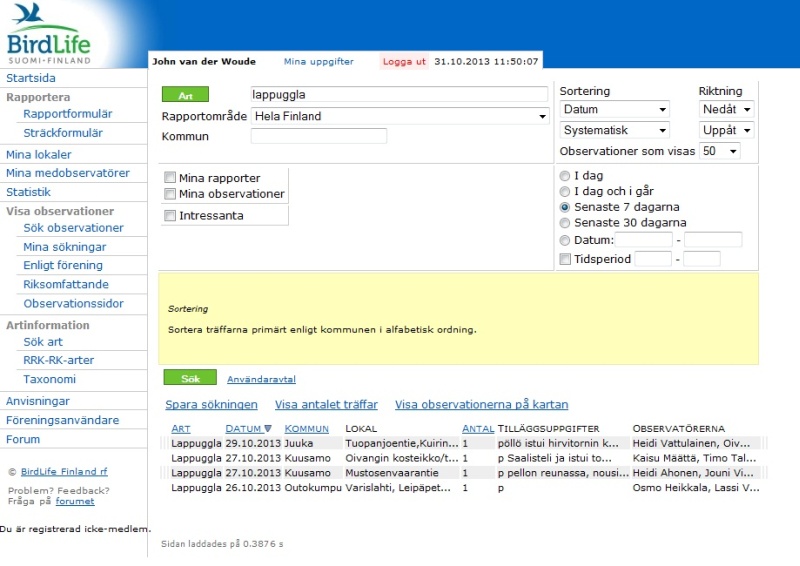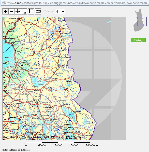 ![]() Dit is het dan, tiira.fi. Zonder deze website zouden we tamelijk hulpeloos naar de doelsoorten hebben moeten zoeken, of afhankelijk zijn geweest van allerlei telefoontjes met lokale vogelaars, als we die al te pakken hadden kunnen krijgen. Als je tiira.fi kort voor vertrek naar Finland raadpleegt kun je van de recente waarnemingen van je doelsoorten informatie zoals kaartjes op je reis meenemen. Als je tiira.fi opent dan is alles natuurlijk in het Fins, maar links onderaan kun je dan om te beginnen het beste kiezen voor Zweeds ('på Svenska'). Zweeds is, ook qua vogelnamen, nog redelijk herkenbaar voor ons, in tegenstelling tot het onmogelijke Fins. Om er goed mee te kunnen werken en redelijk gedetailleerde kaartjes te krijgen van de waarnemingen, moet je wel ingelogd zijn. Maak dus een account aan midden bovenaan (Bli rapportör; wordt rapporteur). Van dat account-aanmeldscherm is användernamn je gebruikersnaam; als je de rest niet begrijpt kopieer die pagina dan even en haal hem door Google Translate; als je liever met de wetenschappelijke namen werkt dan de Zweedse kun je dat aangeven bij Artnamnens språk; vink onderaan aan dat je de gebruikersovereenkomst använderaftalet gelezen hebt - ook die kun je eventueel door Google Translate halen; het andere vinkje kun je leeg laten; je wachtwoord ontvang je per email. Log dan in met användernamn en lösenord (wachtwoord), klik op Logga in. Negeer de eventuele